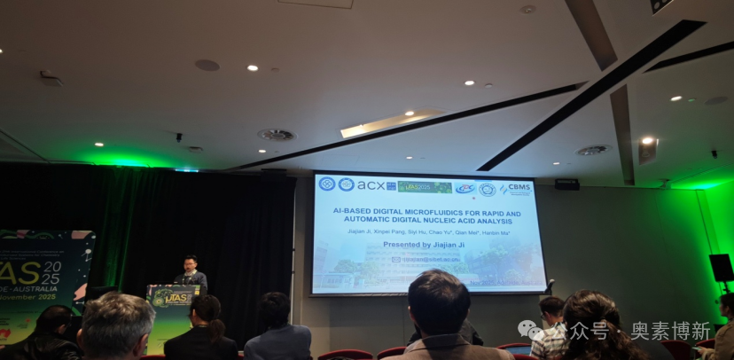 奥素科技(ACX Instruments)与中国科学院团队合作最新成果(AI-BASED DIGITAL MICROFLUIDICS FOR RAPID AND AUTOMATIC DIGITAL NUCLEIC ACID ANALYSIS)在MicroTAS 2025 大会进行了口述报告展示,系统介绍了基于半导体主动矩阵芯片、AI液滴调度和恒温扩增体系的全自动数字核酸分析平台,获得了现场广泛关注与讨论。本次大会现场汇聚来自全球43个国家、超过1000位科研及产业代表 深度交流与展示,今年共有660项工作入选,其中仅有105项工作获得了大会口述报告机会。