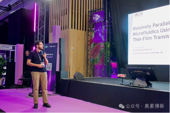 在大会的初创企业闪电演讲环节,奥素科技技术专家Yacine Belgaid发表了"基于薄膜晶体管的大规模并行数字微流控技术"主题演讲,详细展示了薄膜晶体管架构如何实现皮纳升级液滴的高通量、可寻址精准操控。这一技术突破使得数字微流控平台的灵活性和处理通量得到质的飞跃,赢得了现场专家的高度认可。