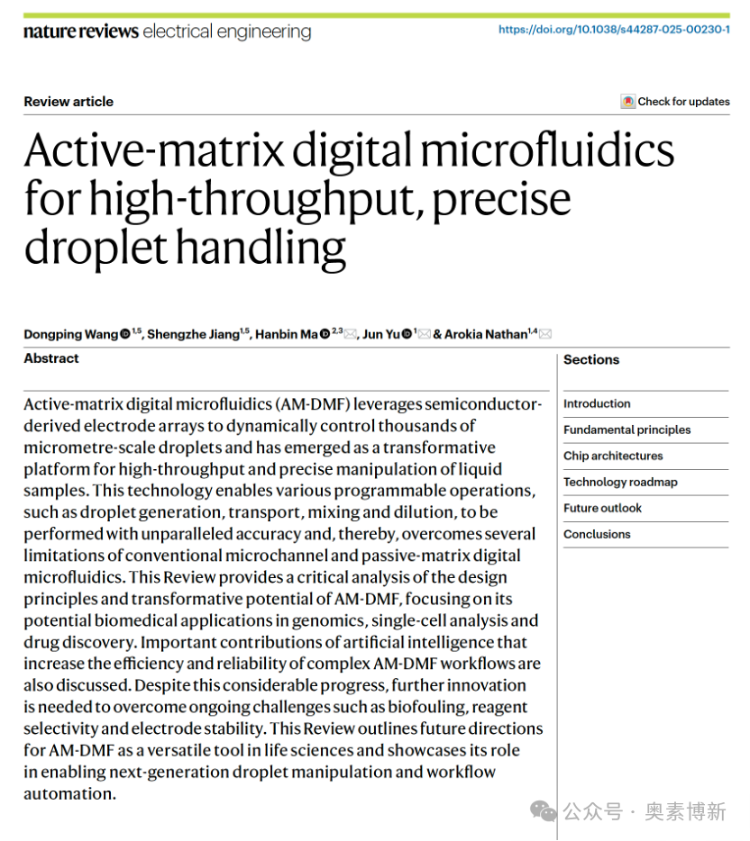 近日,中国科学院外籍院士、英国皇家工程院院士、加拿大工程院院士,奥素科技资深顾问Arokia Nathan教授携手奥素科技马汉彬博士团队在Nature Reviews Electrical Engineering上发表了题为“Active-matrix digital microfluidics for high-throughput, precise droplet handling”的系统综述,全面阐述有源矩阵数字微流控(AM-DMF)的发展全景与技术路线。该论文由助理研究员王东平与博士研究生姜圣哲为共同第一作者,中国科学院苏州医工所与电子科技大学马汉彬教授、于俊教授及Arokia Nathan院士担任共同通讯作者。